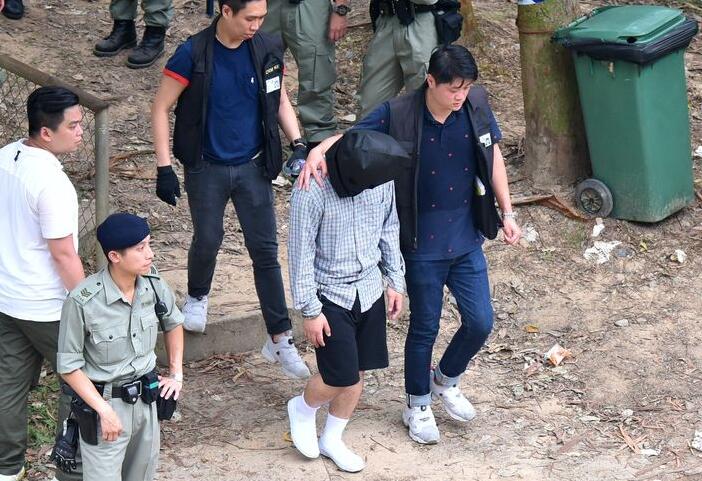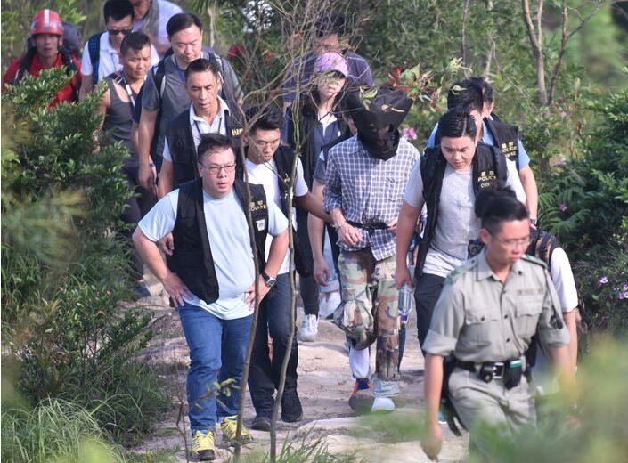 至下午4時許,探員押解姓嚴主犯抵現場案情重組,他穿格仔衫和迷彩長褲,在山頭和一處涼棚被拍攝,傍晚時下山,繼而坐警方7人車往環保署馬游塘中的堆填區,相信是搜尋仍未尋回的兇刀,逗留多30分鐘後離開返署。