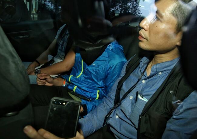 疑犯被鎖上手扣,由警車押送往慈雲山警署。(香港01 王譯揚攝)