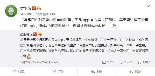 老羅表示:「打賞是用戶對貢獻內容者的饋贈,不是app官方賣東西賺錢,蘋果再這樣不分青紅皂白的,傻x似的流氓亂抽成,遲早被抵制或被收拾……唉。」