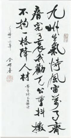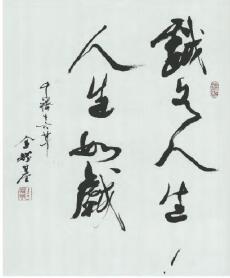 2004年金耀基退任中大校長後,第一時間執起毛筆,重回翰墨世界,並決意定時書寫,每周一兩次,一寫就是六七小時,金耀基甚至認為,「中國審美文化最終表達在書法裏」。兩個多月前,在他平生第一次書法展上,身在普林斯頓的學者余英時特意發來傳真委託董橋代念。這位長金耀基五歲,曾盛讚金氏書法「有一家面目」的「余夫子」寫道:「耀基兄的書法是他藝術人生的最圓滿的體現,卻一向為他的學術志業所掩蓋。我不願將書法從他人生中完全孤立出來。藝術精神貫穿在耀基兄的全部生命之中,書法不過是其中的一環而已。不僅他以『語絲』為名的所有散文是藝術的化身,他在百萬言的學術論述中,也時時流露出藝術的光芒。我們相交四十多年,在記憶中,每次晤聚都自然而然地引出我發自內心的愉悅,好像經歷了一次藝術欣賞一樣。我在室中走動,偶然抬頭看到他贈我的條幅,但我所見到的卻不是書法,而是書法家本人。」