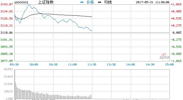5月31日消息,滬深兩市早盤大幅高開,滬指沖高后震蕩回落,滬指盤中一度漲逾1%,創指高開低走。截止午间收盘,滬指報3112.11,漲0.07%,創指報1770.29,漲0.61%。