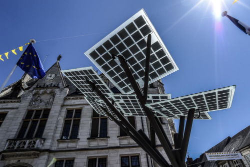 中新網5月31日電 據香港《文匯報》報道,法國中部城市訥韋爾日前「種」下歐洲首棵電子樹,外形充滿未來感,其巨大方形太陽能「葉片」,可將陽光轉化成電力,供行人為手機充電、上網或乘涼。