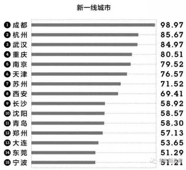 其中,15个进入“新一线”的城市依次是:成都、杭州、武汉、重庆、南京、天津、苏州、西安、长沙、沈阳、青岛、郑州、大连、东莞和宁波。