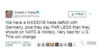 幾個小時候,推特總統發推了,果然又是火力全開,直接將矛頭對準了德國:“我們(美國)對德國貿易存在巨大的貿易逆差,而且他們對北約組織的軍事支出比其應付出的少得多。這對美國很不利。這種情況將改變。”