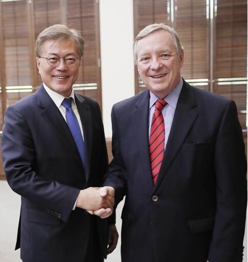韓國總統文在寅接見美國民主黨參議院議員迪克·德賓(右)。(韓聯社)