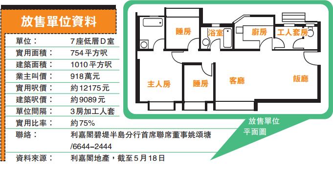 是次介紹單位為「碧堤半島」 7座低層D室,為 3房加工人套房設計,實用面積 754平方呎,建築面積 1010平方呎,屬屋苑中型單位。業主目前意向價約918萬元,折合實用呎價 約12175元,建築呎價 約9089元。單位目前略帶裝修,景觀主要為青馬橋景。