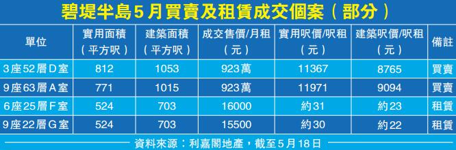 按利嘉閣資料,「碧堤半島」5月已錄不少3房買賣成交。3座52層D室,實用面積 812平方呎,早前約923萬元易手,折合實用呎價 約11367元;9座63層A室,實用面積771平方呎,923萬元沽出,折合實用呎價 約11971元。租賃方面,2房則有不少,6座25層F室,早前便以月租約16000元租出,實用面積524平方呎,呎租31元。