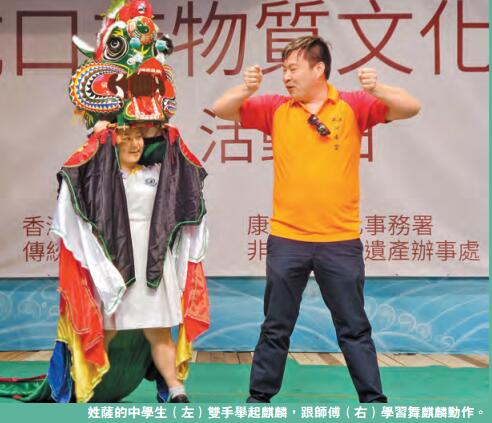 【香港商報網訊】記者周駿報道:自2014年西貢坑口客家舞麒麟列入第4批國家級非物質文化遺產,西貢坑口區傳統客家麒麟協會通過不同形式活動推廣傳統文化教育工作,在今年的天後誕慶典後的5月11日舉辦一場「坑口非物質文化遺產活動日」,當日,除了學者、專業人士講述天後誕、搭棚技術、粵劇神功戲外,更有鄉事人員教授客家麒麟常識及舞麒麟示範,同時邀請聽眾上台體驗舞麒麟,有數位中學生在師傅教授下扮麒麟、學麒麟舞步後表示,手舉麒麟並非辛苦,學步則是舉步為艱。