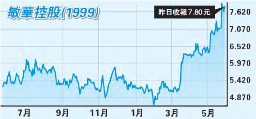 敏華獲花旗將2018及2019財政年度盈利預測上調3%至6%,更獲該行給予「買入」評級,目標價由7.8元升至9.5元,升幅近22%。敏華上日收報7.8元,成交1.32億元,現價距花旗目標價仍有約兩成上升空間。股價在業績後急升,預期現水平整固後,仍有機會再創新高,下一目標8.8元,跌破7元止蝕。