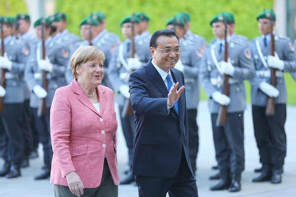 會晤前,默克爾在總理府廣場為李克強舉行隆重歡迎儀式。當李克強抵達時,默克爾前往迎接并共同登上檢閱台。隨后,李克強在默克爾陪同下檢閱了儀仗隊。