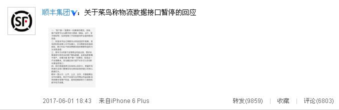 6月1日晚間消息,針對「關閉菜鳥數據接口」一事,順豐集團再做回應,稱客戶仍可從官方渠道及其他第三方信息查詢平臺查詢物流信息,對菜鳥行為表示遺憾。