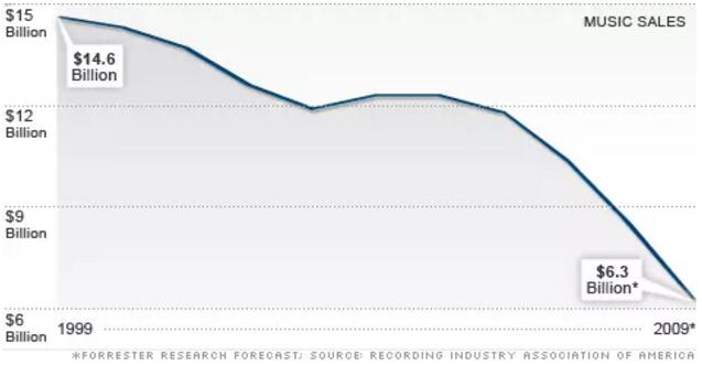 1983 年之後,全球的 CD 銷量連續 17 年增長,在 2000 年達到 24.5 億張的頂點,此後便一蹶不振開始下滑。到 2009 年,美國音樂產業的規模從 1999 年的 146 億美元下滑到僅剩 63 億美元。
