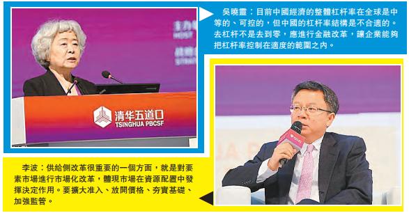 吳曉靈強調,去杠杆是一個動詞,不是完全去掉杠杆,也不是去到零。在嚴厲控制政府債務率上升的同時,應努力進行金融的改革,讓企業能夠把杠杆率控制在適度的範圍之內。