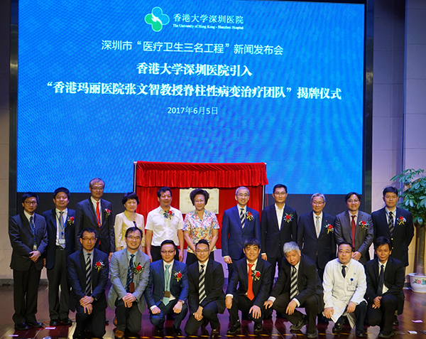 6月5日,深圳市“医疗卫生三名工程”项目——“香港玛丽医院张文智教授脊柱性病变治疗团队”揭牌仪式在香港大学深圳医院举行。