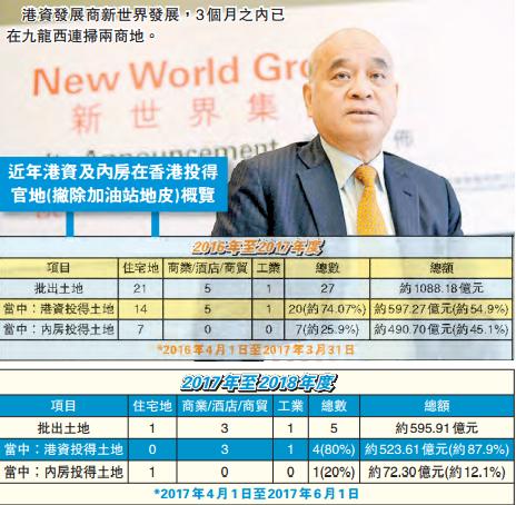 單計5月份3商地,港資發展商已斥資約519.1億元,而上財年,港資在競投官地(包括住宅地、商地及工業用地)上只花了約597.27億元,中資則為490.7億元。