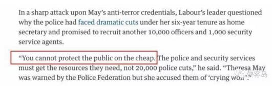 如今,英國大選日漸臨近,借著維穩不利,老對手工黨黨魁科爾賓也猛踩特蕾莎·梅,其在講話中抨擊梅說:“你不可能省著錢就保護了公眾”。說白了,便宜沒好事這話到哪都成立。