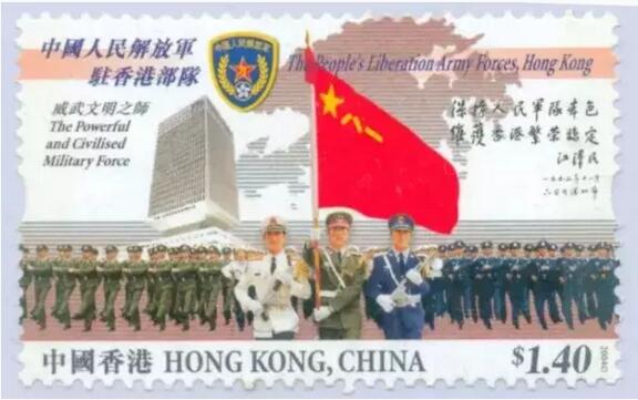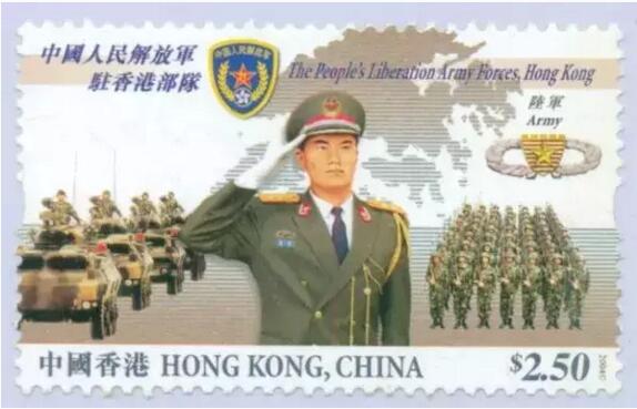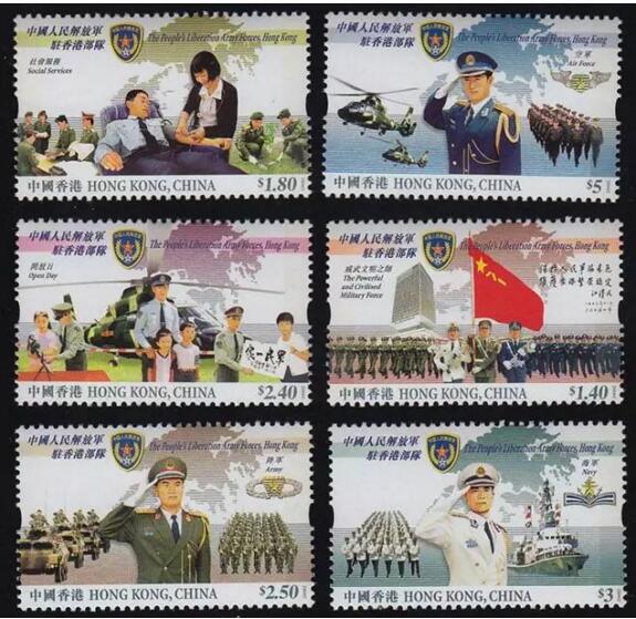 駐港部隊由中國人民解放軍陸軍、海軍、空軍部隊組成,是全軍唯一一支由陸海空三軍合成的部隊,郵票展示了三軍儀仗隊的威武風采。