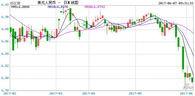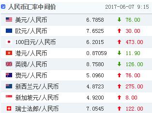 6月7日,人民幣(6.7860, -0.0084, -0.12%)兌美元中間價報6.7858,較上日中間價6.7934升值76個基點。中間價連續6個交易日上升,續創近7個月的新高。