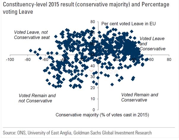圖中可以看出左上角選區的數量幾乎是右下角選區數量的兩倍,說明剩余選票倒向保守黨的幾率比保守黨選票倒向反對黨的幾率要大得多。再加上民調本就顯示保守黨占有優勢,高盛由此認為保守黨勝選且席位擴大幾乎是板上釘釘。