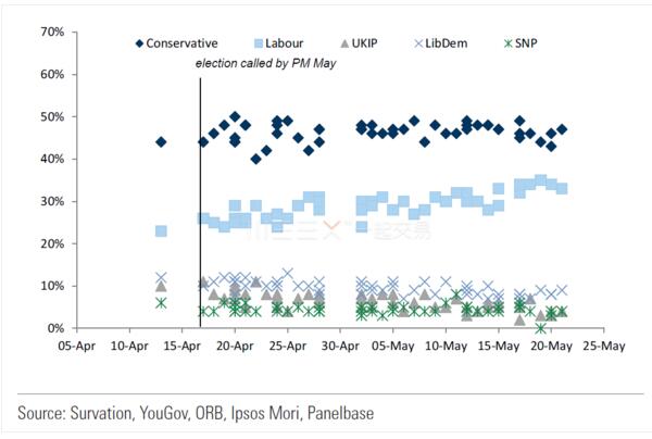 倫敦時間本周四(6月8日)的英國大選就在眼前,原本持有20%領先優勢的保守黨在最新民調中優勢大幅縮水,甚至有民調顯示保守黨目前只領先工黨一個百分點。而結果究竟鹿死誰手、舉世矚目的脫歐進程又將何去何從?高盛在日前的研報中對此次英國大選的結果及其后續影響做了全面分析,洋洋灑灑十頁紙,其心不可謂不誠,其信不可謂不深。WEEX在此總結轉述如下,敬請讀者老爺們一觀高盛手中的“大選劇本”。
