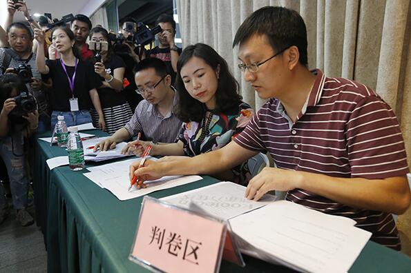 評卷專家正在批改高考機器人AI-Maths所答的北京文科數學卷(圖片來自:澎湃新聞)