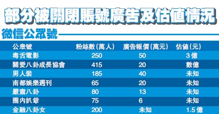 【香港商報網訊】包括「嚴肅八卦」「毒舌電影」「關愛八卦成長協會」在內的25個知名娛樂八卦微信公眾號已被封停,而在此前,包括「第一狗仔卓偉」在內的一眾微博大V也被拿下,背后的投資損失尚無法確切統計。有消息指,被封停的多個微信公眾號此前曾宣布接受投資,各公眾號、微博也接受廣告投放,相關賬號被封停,除了直接影響賬號估值和廣告收入,也可能對投資人以及相關平台的利益帶來影響。