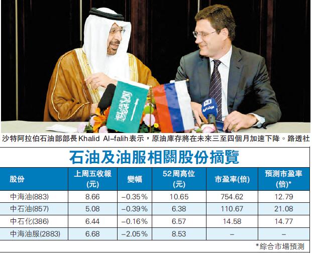 【香港商报网讯】上周油股表現向下,有分析認為與多個波斯灣國家宣布和卡塔爾斷交有關,影響國際油價走勢。不過,沙特阿拉伯石油部部長Khalid Al-falih早前表示,與卡塔爾的問題不會對全球石油產量協議有任何影響;Khalid Al-falih昨日更表示原油庫存將在未來三至四個月加速下降。因此原油庫存加速下降,將有利油價上升,刺激油股股價,首推中海油(883)及中石油(857)。 香港商報記者 勞佩欣