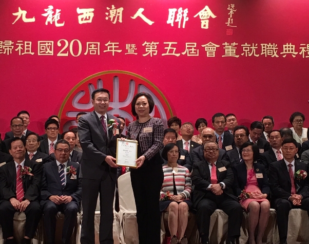 【香港商報网訊】記者謝巧玲報道:九龍西潮人聯會慶祝香港回歸祖國20周年暨第五屆會董就職典禮日前假龍堡國際賓館胡應湘宴會廳隆重舉行,中聯辦九龍工作部部長何靖、食物及衛生局副局長陳肇始、香港潮屬社團總會主席陳幼南、潮州市政協主席楊志明、汕頭市委統戰部部長陳麗文、潮州市委統戰部部長徐和等蒞臨主禮,與近千嘉賓鄉親共同見證新屆會董的誕生。新任會長潘陳愛菁承諾帶領同仁鄉親,秉承聯會宗旨,為會務發展貢獻智慧和力量。