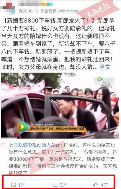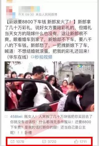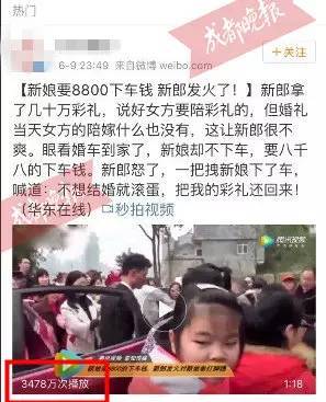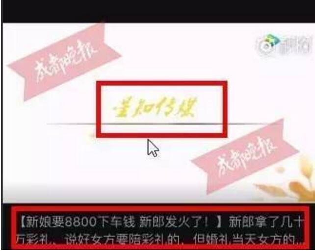 “婚禮是一件喜慶的事情,通常婚禮上新郎都不敢開罪新娘。但今日這場婚禮卻顯得有些分外,婚車到達要下車的一會兒,新郎發火了,對新娘拳打腳踢……”成都晚報記者打開這一段時長為1分18秒的視頻看到,視頻畫面并未標明時間、地點、人物等具體信息,模糊的畫面僅配有一段女聲旁白,旁白內容異常火爆,包含“新郎對新娘拳打腳踢”、“幾十萬彩禮被丈母娘藏起來給新娘弟弟用”、“新娘索要8800元下車費”、“不愿意成婚滾蛋,把我的彩禮還回來”等充滿矛盾、戲劇化的元素。該視頻經全國各大媒體轉發報道后,迅速引起網友熱議,大多網友站在了新郎的一方,指責新娘及其家人:“娘家人也是夠惡心了,這是賣女兒嗎?”