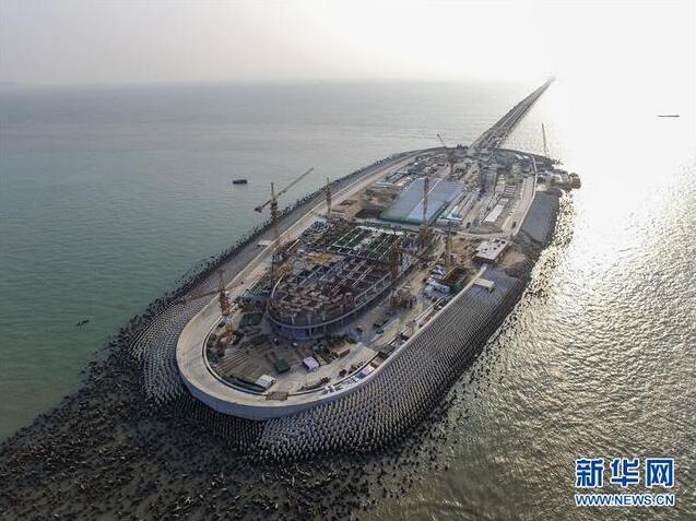 這是鳥瞰港珠澳大橋建設中的西人工島(4月28日攝)。創下多項世界之最,橋島隧合一的港珠澳大橋海底隧道工程部門最終接頭于5月2日正式吊裝沉放,它的對接成功將標志著全長5664米的海底隧道全線合龍。新華社記者 劉大偉攝