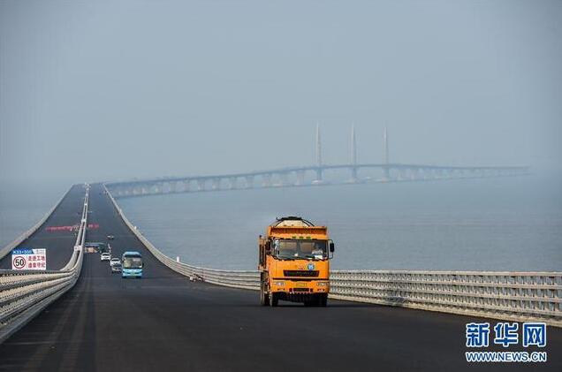 一輛運輸瀝青的工程車輛行駛在港珠澳大橋橋面上(4月29日攝)新華社記者劉大偉攝