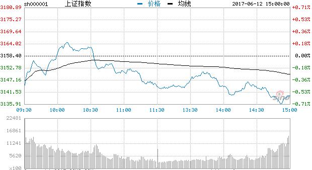 6月12日消息,兩市早盤受上證50拉動呈現分化走勢,隨后滬指沖高回落,由升轉跌,兩市午后基本維持弱勢震蕩,尾盤擴大跌幅,成交量再度萎縮,創指跌逾1%,成交量創一個月以來新低。截止收盤,滬指報3139.88,跌0.59%,創指報1775.55,跌1.15%。