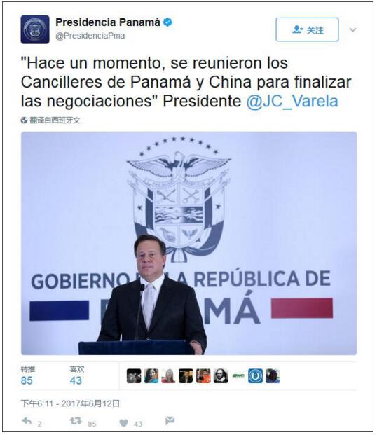 今天上午9時,巴拿馬總統胡安·卡洛斯·巴雷拉(Juan Carlos Varela Rodriguez),在國家電視臺全國新聞聯播節目上,正式向全世界宣布:巴拿馬共和國與中華人民共和國建立外交關系。