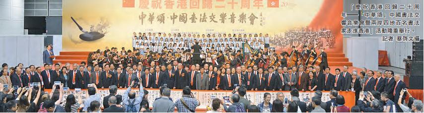 音樂會上,香港交響樂團演奏了《東方之珠》、《我是中國人》、《龍的傳人》等10餘首具中國特色的樂曲,書法家們在悠揚的音樂聲中即場共書長卷。最后,嘉賓、百位書法家與香港學生合唱團合唱《歌唱祖國》,將活動推向高潮。