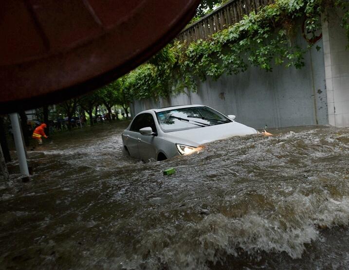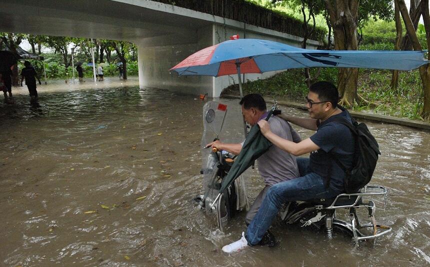 6月13日早晨9時許正值上班時間,受臺風苗柏影響深圳多處水浸,在深圳市深南新洲路立交橋下,水浸及膝,給上班和上學的市民帶來不便,人們脫了鞋從水里通過,更有汽車沖水而過導致熄火。金羊网記者 王磊 攝