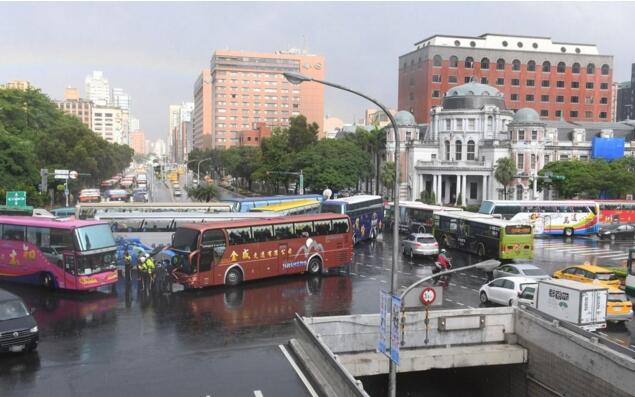 多輛游覽車13日上午前往台交通部門抗議,造成十字路口交通癱瘓,台警方派員到場交涉。