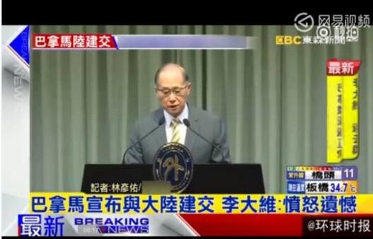 台灣方面當然不淡定了!其 “外交部”部長李大維在上午的緊急會議上稱,對此表示憤怒與遺憾,為維護“主權”與尊嚴,將與巴拿馬政府“斷交”,全面停止雙邊合作及援助,撤離“大使館”以及技術團人員。
