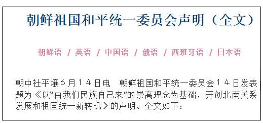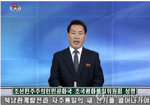 據朝鮮中央通訊社報道,朝鮮祖國和平統一委員會14日發表聲明,聲明中提出的原則立場稱,首先“民族自主是解決統一問題的根本保證和基本原則 ”,韓國應投身于發展南北關系和完成祖國統一大業的堅定立場。
