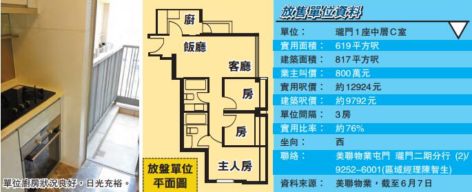 是次介紹單位為屋苑1座中層C室,3房一套設計,實用面積約619平方呎,建築面積817平方呎,實用比率約76%。業主叫價約800萬元(截至6月7日),折合實用呎價約12924元,建築呎價約9792元。單位向西,景觀開揚。