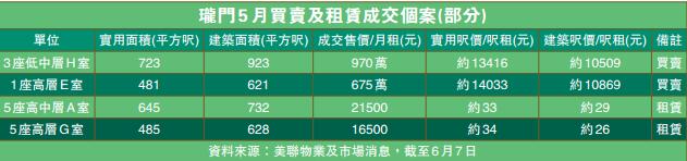至於買賣成交方面,「瓏門」上月有15宗成交,平均成交呎價約14319元,按月下跌103元或0.7%。6月份則已有不少成交,當中3座低中層H室,4房單位,早前以970萬元易手,按實用面積723平方呎計,呎價約13416元。1座高層E室,2房單位,675萬元賣出,實用面積481平方呎,呎價約14033元。