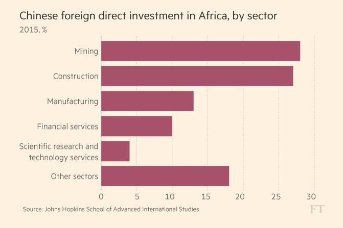 約翰?霍普金斯大學的研究人員表示,自2000年以來,埃塞俄比亞一直是中國對非貸款的第二大接收國,該國的水壩、公路、鐵路和制造業工廠獲得了逾123億美元融資。這一數字比中國向石油豐富的蘇丹和礦產豐富的剛果提供貸款額的兩倍還多。實際上,美國對非直接投資流向礦業的比例高于中國,美國為66%,而中國為28%。