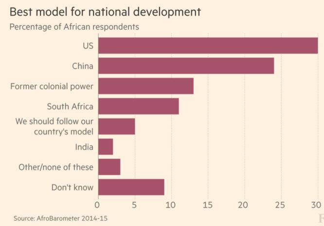2016年,民調機構非洲晴雨表(Afrobarometer)對36個非洲國家進行的一項調查發現,63%的非洲人認為中國的影響力“有幾分”或“非常”積極。在被問及哪些國家為非洲提供了最佳的發展模式時,30%的受訪者稱美國,24%選擇了中國,美中兩國分列第一和第二。然而,也存在對中國影響力不斷擴大的擔憂。“我認為中國人知道自己想要什么。但非洲人不知道自己想要什么,”肯尼亞法學院(Kenya School of Law)院長帕特里克?洛克·奧蒂恩諾·盧蒙巴(PLO Lumumba)說,“中國想要的是控制權。中國希望成為世界強國。”非洲各國政府欠中國太多債務,以至于它們將在經濟和政治上都受制于北京,他補充道。