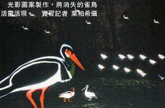 至於製作雀鳥光影圖案,原理與Light Painting相若,由導師張偉樂帶領一班對觀鳥有興趣的學員到南生圍,以光印重塑一些以前曾在香港出現,但現今已消失的雀鳥,如翹鼻麻鴨、勺嘴鷸、黑鸛等。張偉樂指出,製作過程頗為複雜,必須先把圖案裁剪出來,貼上玻璃紙來增補雀鳥的細節顏色,待入黑時利用閃光燈,將雀鳥圖案套住,然後將相機長時間處於曝光的狀態,最後再將圖案印在相片上。
