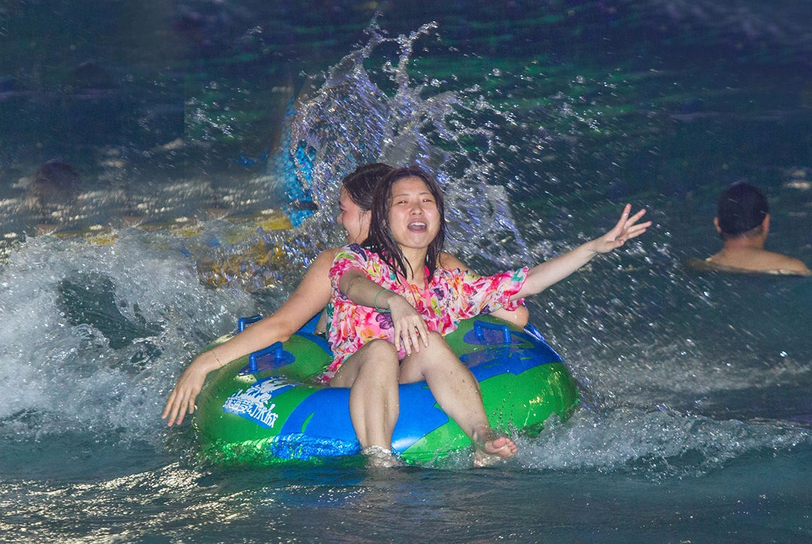 據夢幻水城負責人介紹,繼去年新增的“合家歡滑道”之後,今年再增“新成員”——全新雙螺旋旋風滑道。雙螺旋滑道分為紅藍相間的封閉式和黃綠相間的敞開式兩條滑道,鮮豔的顏色更添幾分夢幻,每條滑道長142米,最高平台達13.3米,其中封閉式螺旋滑道更具有流光溢彩效果。滑行者在螺旋回轉、左右擺動滑行的過程中,體驗透明、流光、黑洞、開敞滑道的蜿蜒交錯和時空變幻,充分領略非自主滑行的刺激快感,完成一次驚險之旅。