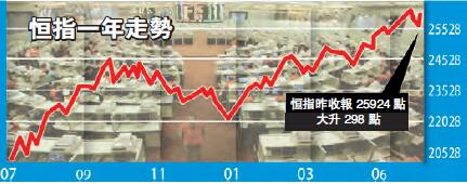 【香港商報网訊】記者伍敏報道:A股入MSCI明天揭曉,港股偷步升近300點,再迫近二萬六大關。恒生指數昨天高開過百點后升幅擴大,一舉升穿10天及20天線,收報25924點,升298點或1.16%。國企指數收報10520點,升135點或1.31%。惟成交僅656億元,是6月首次不足700億。