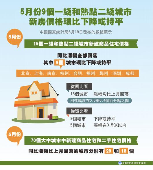從同比漲幅來看,據測算,一線城市新建商品住宅和二手住宅價格同比漲幅均連續8個月回落,5月比4月分別回落2.2和1.7個百分點;二線城市新建商品住宅和二手住宅價格同比漲幅分別連續6個月和4個月回落,5月比4月分別回落0.8和0.5個百分點。