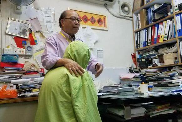 朱婆婆怕樣子在傳媒中曝光影響女兒情緒,戴上口罩穿雨衣接受採訪。