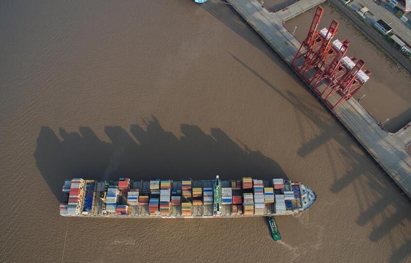 圖:一艘載有集裝箱的貨輪即將停靠寧波舟山港穿山港區集裝箱碼頭裝卸。 新華社記者 黃宗治 攝