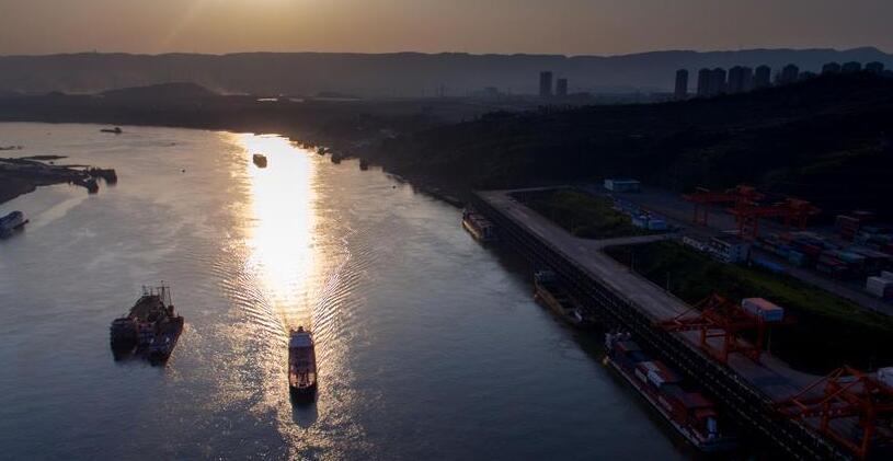 圖:落日餘暉下,貨輪沿長江航道從重慶果園港水域通過。 新華社記者 劉潺 攝