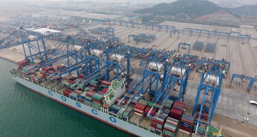圖:載箱量13386標准箱的外貿集裝箱船“中遠法國”輪在青島港全自動化集裝箱碼頭靠泊作業)。新華社記者 朱崢 攝
